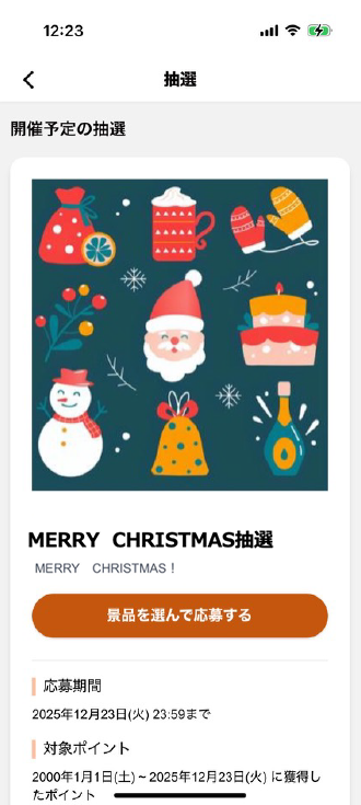当選した場合は、アプリ上でプッシュ通知が届きます(令和8年1月9日を予定)ので、通知に記載されているURLにアクセスをして、デジタルギフトをお受け取りください。当選者の発表は、当選通知をもって代えさせていただきます。